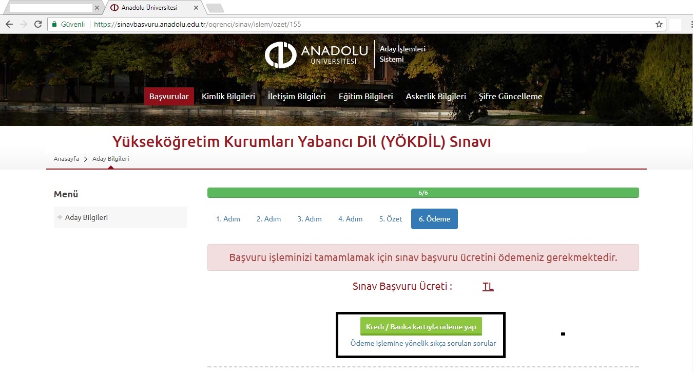 16. Sınav başvurusu için bütün bilgilerinizi tanımladıktan sonra artık sıra ödeme aşamasında. Önünüze çıkacak bu ekranda yer alan “Kredi/Banka kartıyla ödeme yap” butonuna tıklayınız.