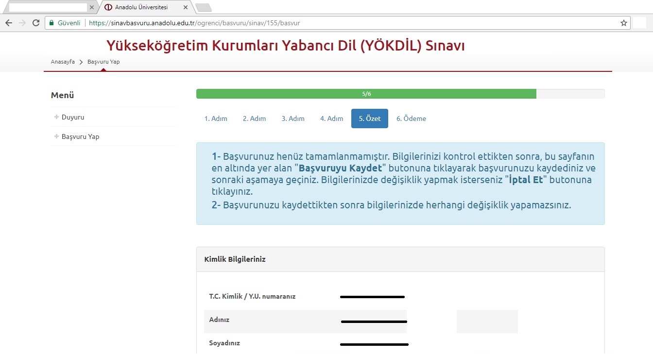 15. Önünüze çıkan ekranda verdiğiniz bilgilerin bir özeti yer alacak. Herhangi bir problem yoksa alt tarafta yer alan “Başvuruyu Kaydet” butonuna tıklayınız. Şayet bir problem varsa 9.aşamadan tekrar başlayınız.
