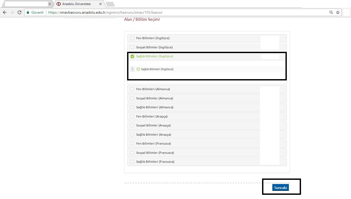 Başvuruyu yapacak Tıp Fakültesi öğrencileri “Sağlık Bilimleri (İngilizce)” seçeneğini işaretleyecekler. Daha sonra alt tarafta yer aşan “Sonraki” butonuna tıklayınız.
